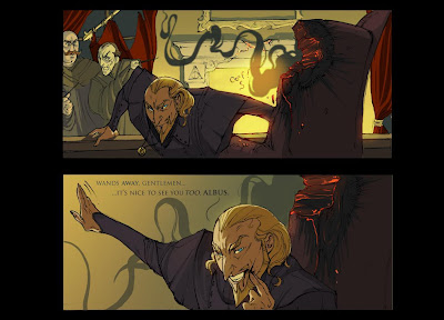 "Terrifying, is it not?" asked the disfigured man, his voice emanating not from the lipless mouth, which remained unmoving, but from the bright tip of the wand he carried. "I never dreamed that the price for my freedom would be so steep. To be confined to a mutilated body that never heals is a nightmare far beyond your comprehension. Be thankful for what you have, girl."